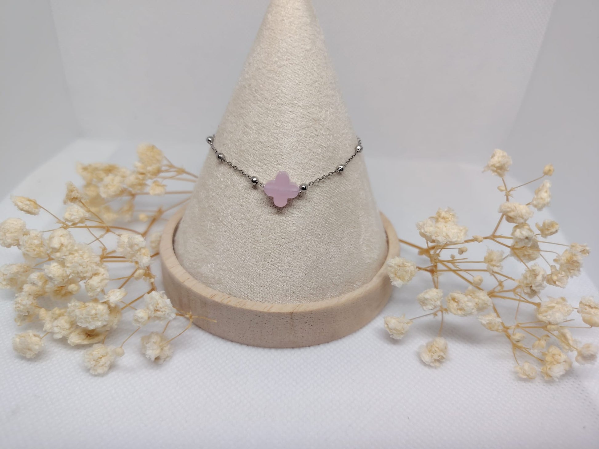 Apportez une touche de douceur et de chance à votre poignet avec ce bracelet trèfle rose en acier inoxydable. Son pendentif en forme de trèfle, délicatement teinté de rose pastel, symbolise la chance, l’amour et la délicatesse. Associé à une chaîne fine ornée de petites billes argentées, ce bijou incarne une élégance subtile et intemporelle.